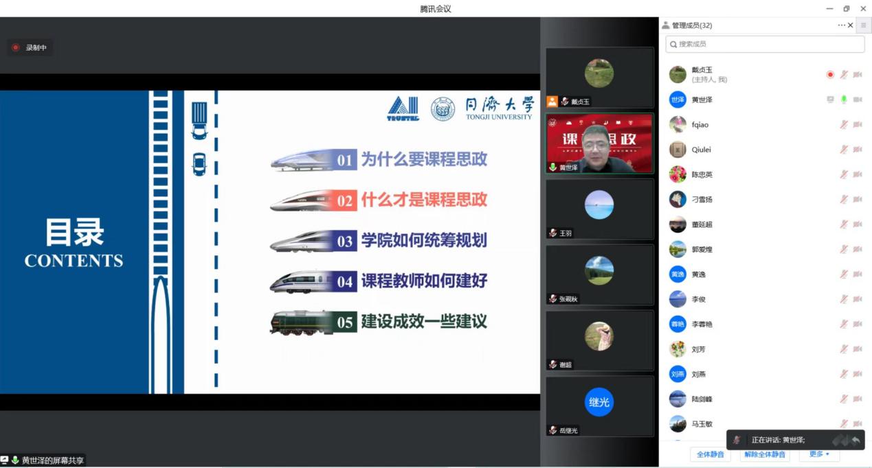 学院副院长周俊鹤在致辞中表示,近年来学校持续推进课程思政重点课题研究和课程思政改革,各二级学院也在全面落实课程思政教育教学改革。目前交通学院已探索了一套结合学科专业特色的课程思政实施体系,并积累了丰富的实践经验。非常荣幸邀请交通学院为探花直播