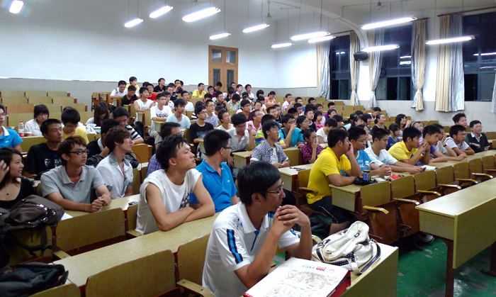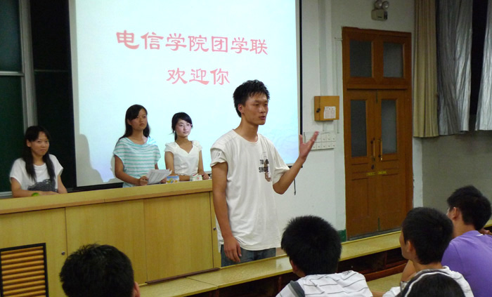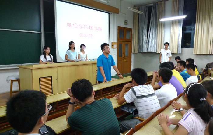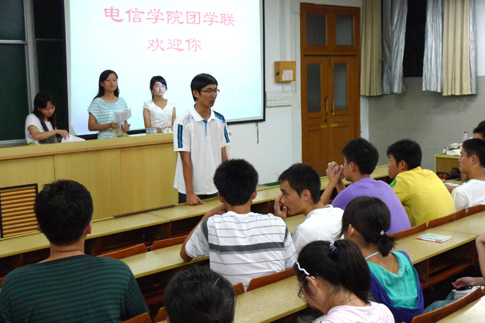 迎来了2010年级527名本科新生,他们的到来,犹如一股新鲜的血液涌入校园。从新生入校第一天起,团学联的招新工作也有序地在新生中进行,经过学生骨干们广泛宣传,就收到了近400份报名表。10日下午,团学联老师和学生骨干分6间教室对报名者进行了面试。