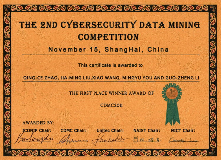 由控制系李国正研究员、尤鸣宇博士为指导,研究生赵庆侧、刘家铭、王晓组成的LeVis研究组参赛的新闻类、入侵检测类和邮件过滤3个题目,获得此次数据挖掘竞赛总分第一名,并应邀在数据挖掘与安全研讨会做主题演讲。