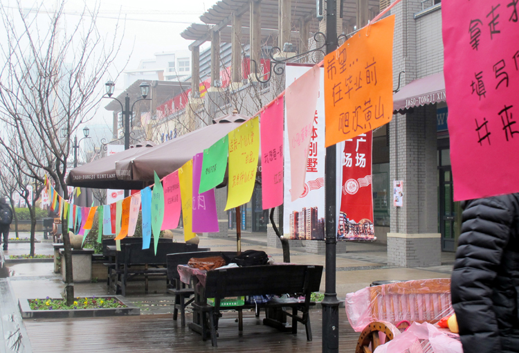 “我想要一个鸡蛋饼多加葱,多加榨菜”,“我想有人帮我实现遗传算法”,3月5日、6日在嘉定校区新天地的路上,一张张纸条贴在细绳上串起一条五彩斑斓的彩带。仔细一看,上面写满了女生的心愿。不时有男生停下脚步看看纸条,有一个男生径直走向一张纸条,摘了下来。