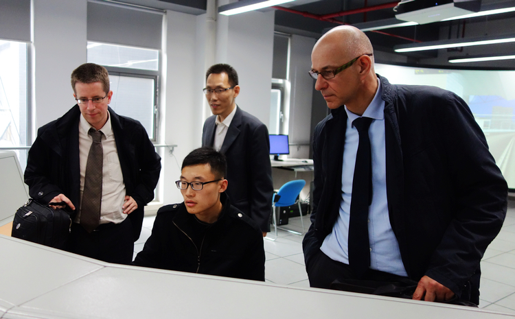 COUTELIER教授等参观了虚拟现实技术工程平台、嵌入式视频监控平台及脑认知与智能系统试验平台,并和平台研究人员进行了交流。随后,双方在305会议室进行了会谈,并表达了在已有框架协议的基础上,切实开展学生互换项目的意愿。
