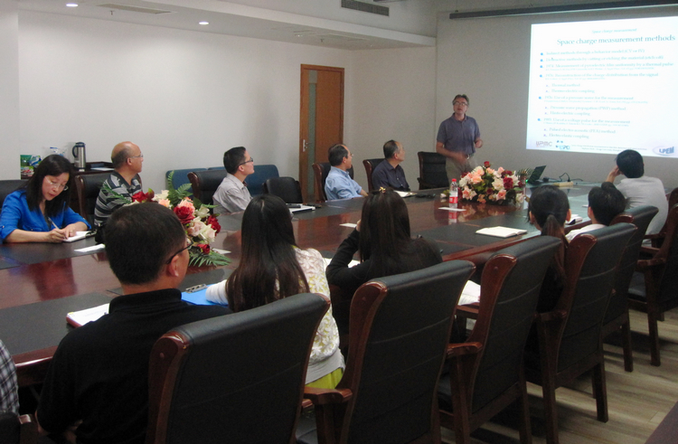 师生作了题为“Space charge distribution measurement in thin film dielectrics and semiconductors”的学术报告。他对如何准确测量薄膜电介质和半导体的空间电荷分布,从理论推导到实际测量作了精彩详细的讲解。报告结束后,Stéphane Holé教授与探花直播