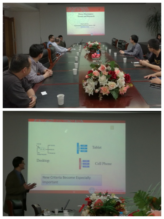 Brad Lehman教授作了题为“Power Electronics: Trends and Research”的学术报告。报告就电力电子技术过去十年间的发展和相关研究进行了介绍。低压小功率应用方面介绍了电力电子在手机和LED照明方面的应用;高压大功率方面针对新能源发电并网进行了介绍,如太阳能发电和风力发电中的直流输电技术采用了多电平变频器;还介绍了有源滤波、无功补偿等电力电子技术在改善电能质量方面的应用;最后介绍了美国东北大学太阳能发电系统中电力电子技术的使用案例。
