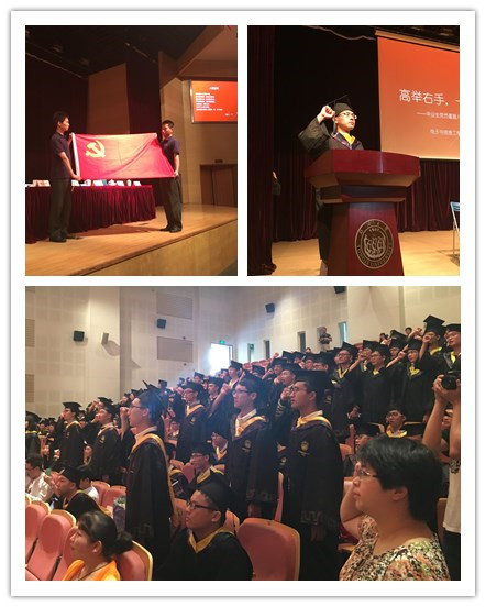 上午10点,严肃庄重的毕业典礼正式开始,学校、学院分别寄语了学生们殷切的希望和美好的祝福,毕业生们表达着对母校的依依不舍。学院在毕业典礼之后,进行了一个特别环节,这也是学院“两学一做”的系列活动之一。由历任了三届学生党支部书记的毕业生鲁越领誓,全体毕业生党员面对党旗,举行了“高举右手,一生承诺”的毕业生党员重温入党誓词仪式。毕业生党员们通过重温入党誓词,坚定理想信念、牢记使命担当,用这种特殊的方式庆祝党的95岁生日,同时也庆祝自己圆满完成大学学业、走向更美好的明天。(程莉)