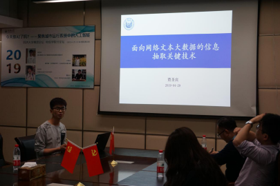 的贾圣宾博士,贾圣宾博士是2016级直博生,2018年国家奖学金获得者。研究方向为自然语言理解、机器学习、知识图谱。目前已见刊论文包括ACM Trans1篇、CCF A类会议1篇、EI会议数篇。贾博士此次汇报的题目是面向网络文本大数据的信息抽取关键技术,一方面贾博士以学术道德为基准,强调了学术目标的重要性,向同学们传达了贵在坚持、乐观对待的学习态度。另一方面,贾博士从文本语义理解的基础—信息抽取技术作为出发点,向同学们介绍了如何从文本中识别命名性指称项,并对信息抽取进行应用价值评估,使得同学们进一步了解了信息检索、语义理解、知识获取、文本生成等技术在交通、医疗、金融等应用场景中起到的作用。