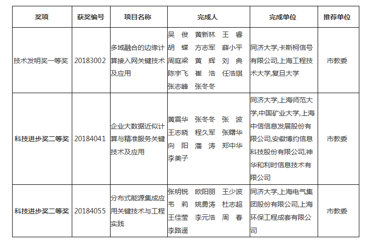 窗体顶端2019年5月15日,2018年度上海市科学技术奖励大会召开。其中,探花直播 吴俊教授领衔的“多域融合的边缘计算接入网关键技术及应用”获得技术发明一等奖,张明锐教授领衔的“分布式能源集成应用关键技术与工程实践”、黄震华研究员领衔的“企业大数据近似计算与精准服务关键技术及应用”获得科技进步二等奖。