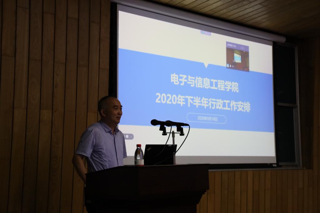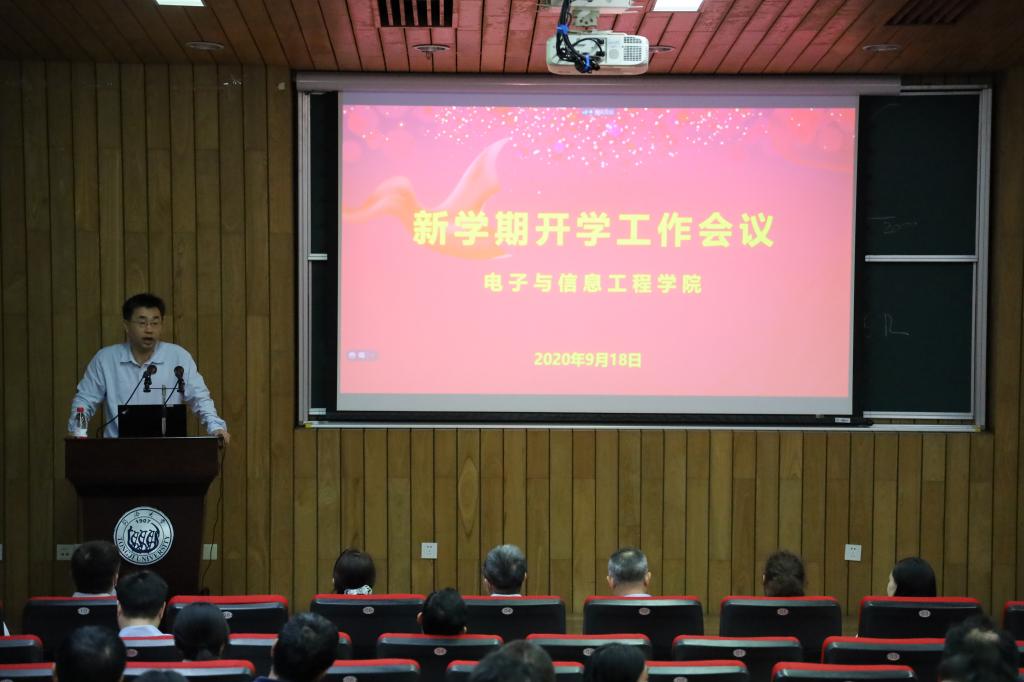 2020年9月18日下午,学院在智信馆117报告厅召开新学期工作会议。学院党政领导班子成员、党委委员、各系(中心)领导、各总支领导及支部书记、新进教师等现场参会,其他教师线上参会,会议由学院党委副书记(主持工作)向阳主持。
