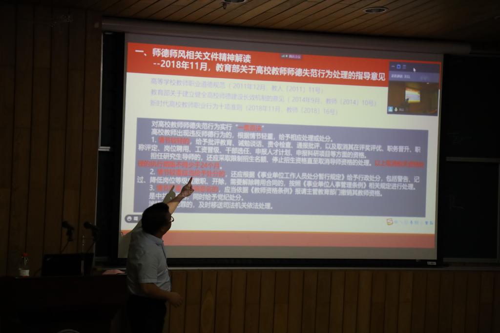 学院党委副书记余有灵对学校师德师风文件精神进行解读,介绍学院即将出台的师德师风考核办法。他指出,师德师风建设贯穿教师管理的全过程,希望每位教师予以重视。他结合近年来一些高校出现的“学术不端、套用科研经费”等代表性案例,警示大家引以为戒,不断强化自身的师德师风建设。