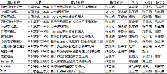 控制系教师张志明指导,自动化专业的黄定梁、吴泽铭、巴志彪组成的“两片面包夹芝士”队获应用赛道ST赛题全国二等奖1项;计算机系刘庆文、控制系张志明指导,信息安全专业的陈子翔、张子阳、孙卓阳同学组成的“CPU写的都队”队、控制系张志明、王晓年指导,杨怡(自动化)、程新元(计算机科学与技术)、周琪(电子信息)组成的“百事可乐”队获得应用赛道海思赛题全国三等奖2项。同时,这3支队伍9名队员已在先期举办的东部赛区比赛中获得一等奖。除此之外,东部赛区另有2支队伍6名队员获得二等奖,6支队伍18名队员获得三等奖。