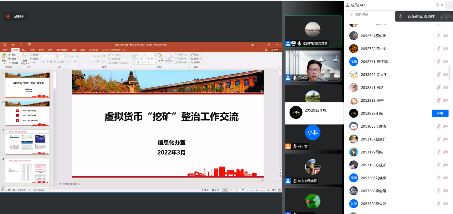 学院党委副书记朱琴跃介绍了学院整治虚拟货币“挖矿”活动的工作进展,指出通过学院党政联席会多次专题讨论、院内自查自纠、制定出台整治“挖矿”行为管理办法等举措,学院专项整治工作已初见成效。她号召师生从思想上做到警钟长鸣,从自身做起,遵守教育部、学校及学院的管理规定,加强专业知识学习,做好自查自纠,防范与整治两手抓,共同努力,实现“挖矿”行为清零目标。