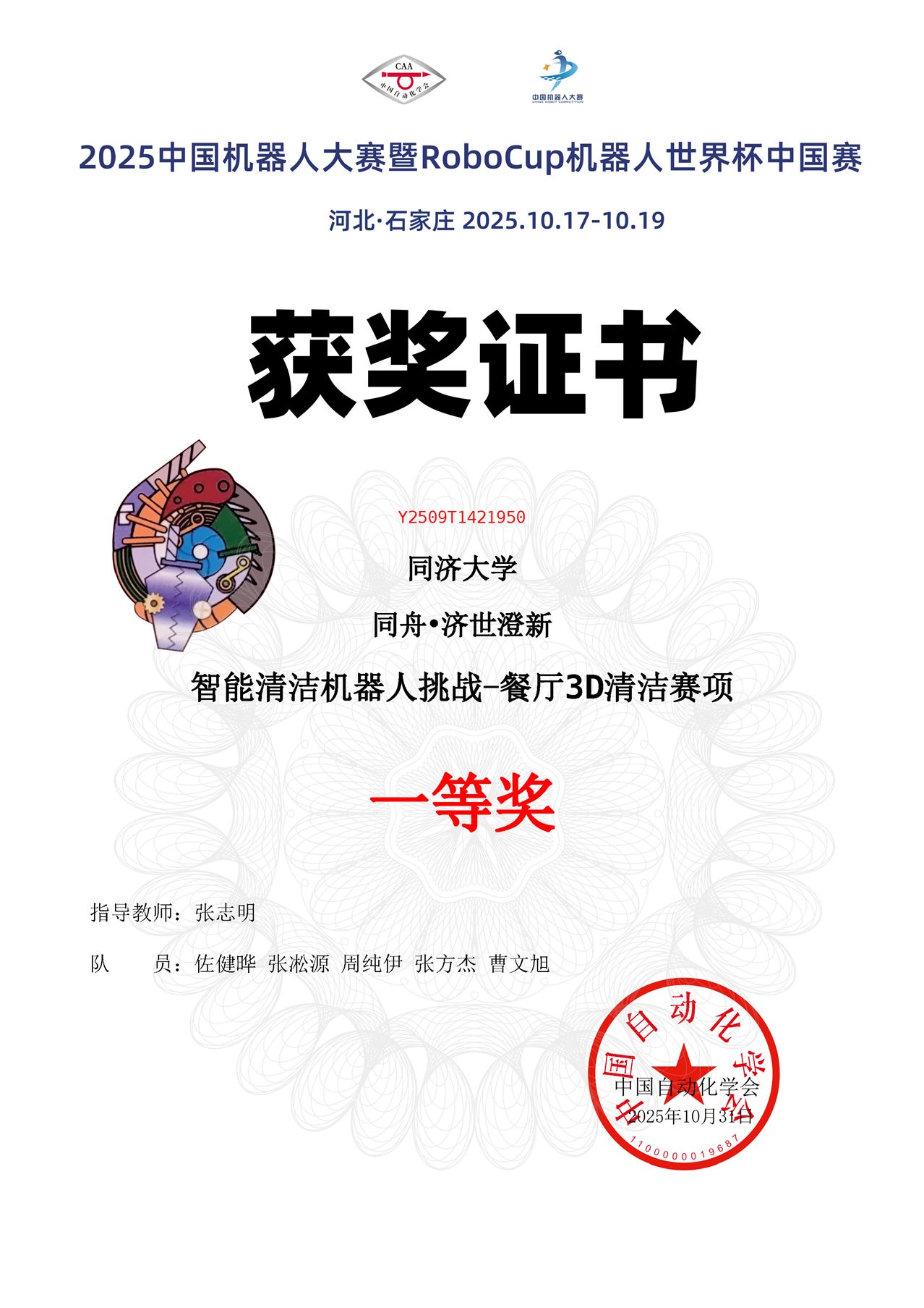 学生为骨干,汇聚了四个学院的优秀学子。团队在控制系张志明、工程实践中心杨晓圆及控制系朱劲老师指导下,由张旭磊(自动化)辅助管理,在四个赛项中均取得突破:同舟•济世澄新队斩获智能清洁机器人挑战-餐厅3D清洁赛项全国一等奖,队长为佐健晔(自动化),队员包括张凇源(自动化)、周纯伊(中德工程学院/机械电子工程)、张方杰(控制科学与工程)、曹文旭(电子信息);智信•Hawkeye队伍获机器人先进视觉赛3D识别赛项全国二等奖,队长为陈婉琳(自动化),队员包括王潇扬(计算机科学与技术学院/计算机科学与技术)、王星达(微电子科学与工程)、汤睿晨(自动化)、张慧(微电子科学与工程);智信•侦防先锋队伍获公共安全侦查机器人赛项全国三等奖,队长为吴佳佳(通信工程),队员包括张亦弛(电气工程及其自动化)、霍睿(通信工程)、谢承兴(人工智能);同舟共济队获武术擂台赛仿人格斗赛项全国三等奖,队长为宗慕雪(电气工程及其自动化),队员包括陆欣蕊(电气工程及其自动化)、史艺雯(土木工程学院/智能建造)。