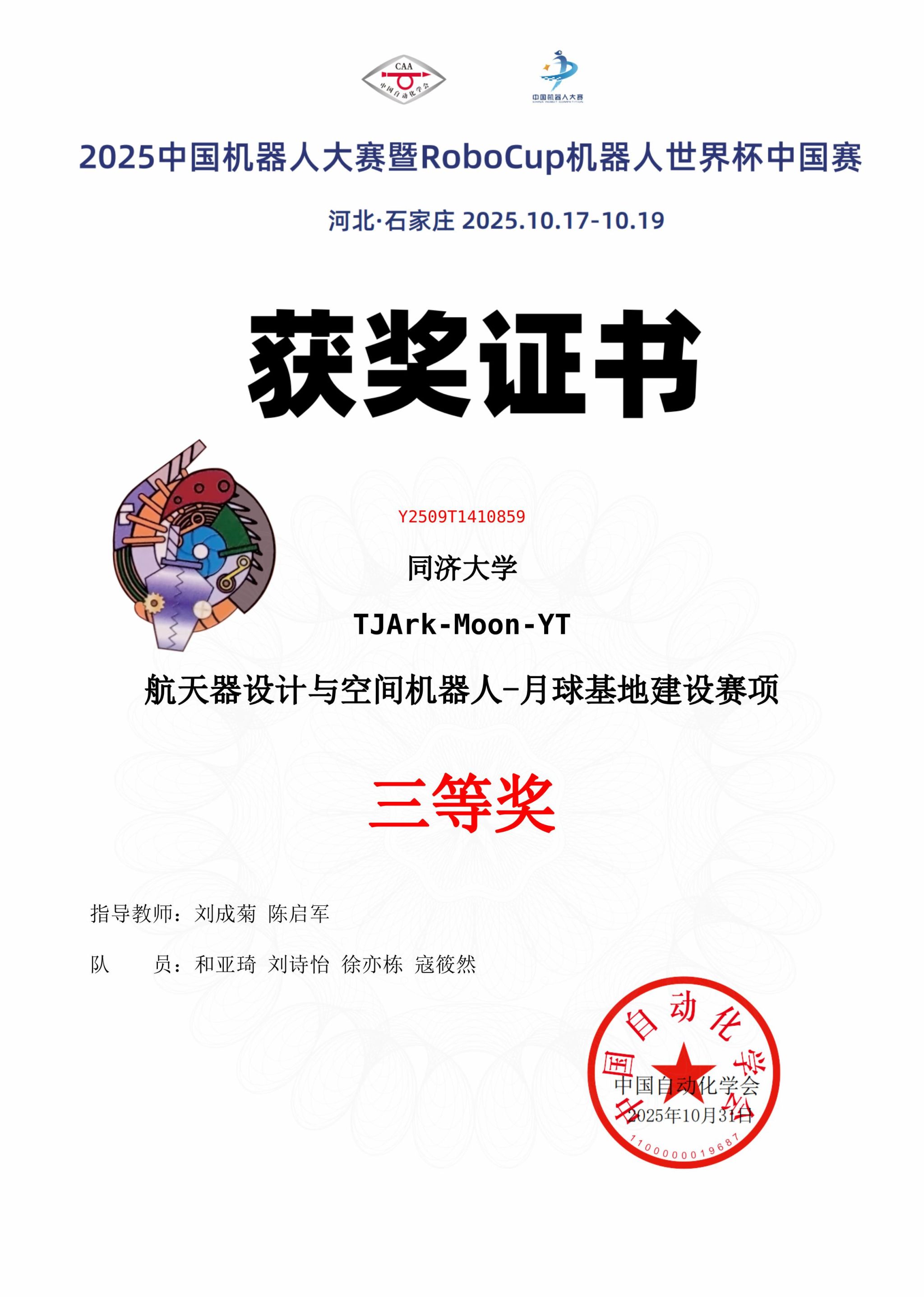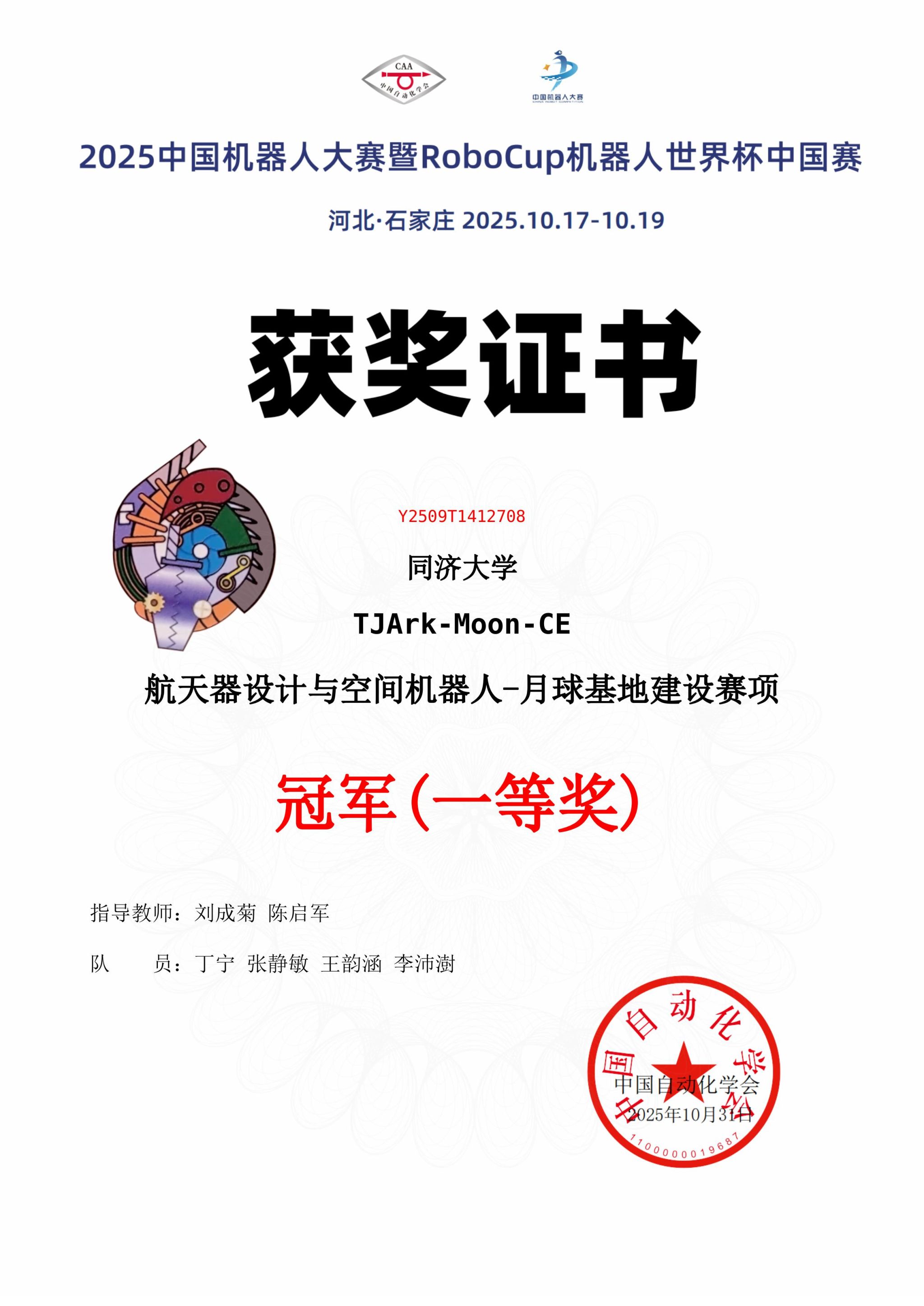 学生为主,汇聚了三个学院的优秀学子,由控制系陈启军、刘成菊老师指导,并由学生罗烨(自动化)、任筱舒(人工智能)及张旭晖(控制科学与工程)辅助管理。其中,TJArk-Moon-CE队勇夺全国冠军(全国一等奖),队长为丁宁(人工智能),队员包括张静敏(计算机科学与技术学院/数据科学与大数据技术)、王韵涵(计算机科学与技术学院/计算机科学与技术)、李沛澍(国豪书院/微电子科学与工程);TJArk-Moon-YT队获全国三等奖,队长为和亚琦(计算机科学与技术学院/计算机科学与技术),队员包括刘诗怡(计算机科学与技术学院/数据科学与大数据技术)、徐亦栋(自动化)、寇筱然(电气工程及其自动化)。