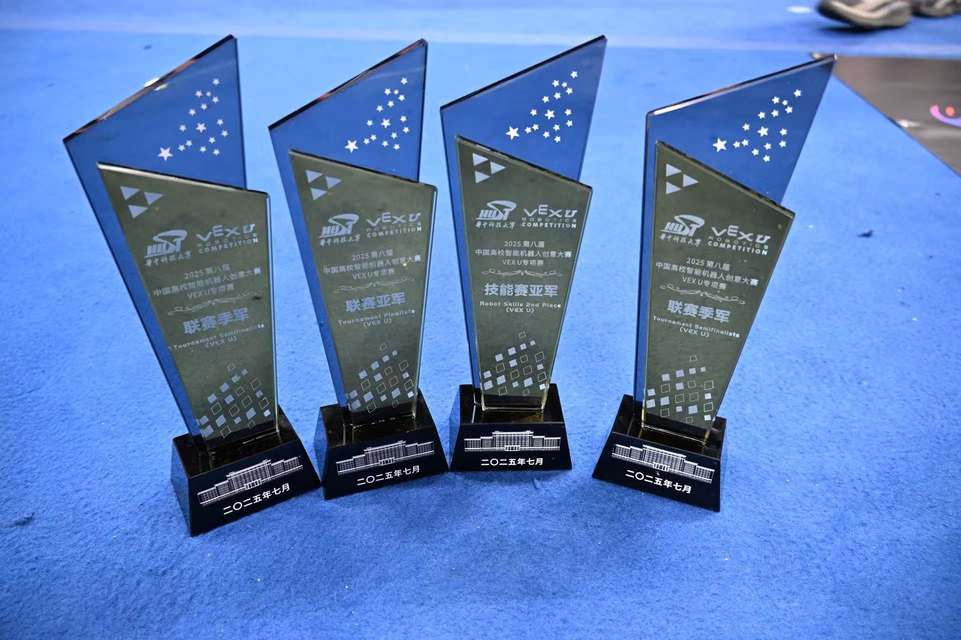 VEX机器人创新实验室成立于2017年,连续八年参与VEX机器人竞赛,为成员们提供实验器材、场地和技术培训;实验室成员们参加了诸多电子信息类比赛,申报了若干创新项目。在过去的2023-2024赛季和2024-2025赛季,实验室成绩斐然,共获得全能奖(最高奖项)2次,技能赛或对抗赛全国冠军5次,全国一等奖2次,设计奖2次,巧思奖2次等多项奖项。